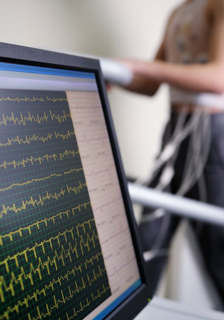 Monitorizarea frecvenței cardiace, tensiunii arteriale și activității electrice a inimii pe parcursul testului.