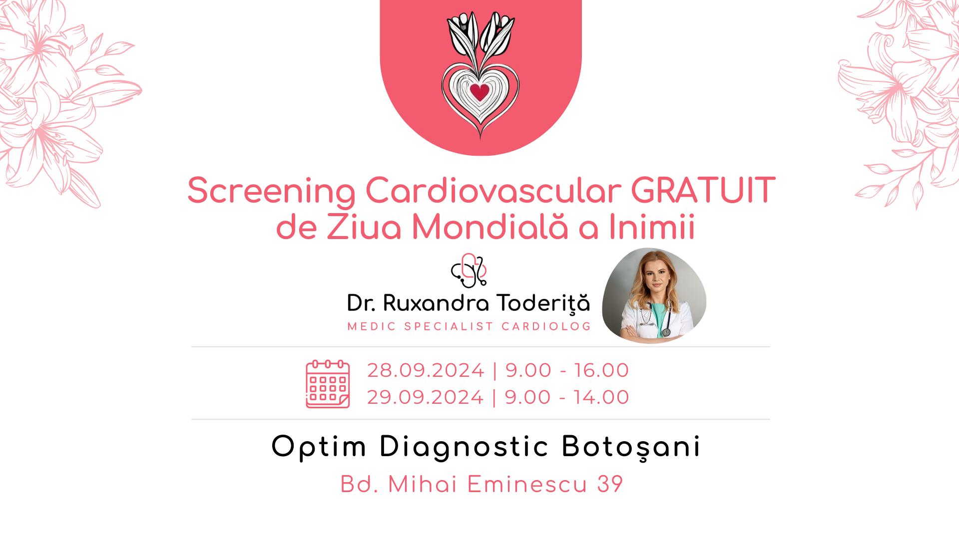 Evenimentul special este organizat în colaborare cu Clinica Optim Diagnostic Botoșani!  Acest screening se adresează persoanelor cu vârsta de peste 40 de ani aparent sănătoși care nu au făcut un consult cardiologic recent. Screeningul nu înlocuiește un consult cardiologic complet.